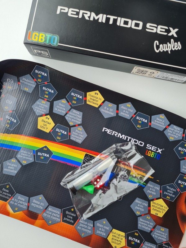 Juego para parejas LGBTQ. Incluye tablero, dado, reloj de arena, 2 fichas, mazo de cartas kamasutra y manual de instrucciones