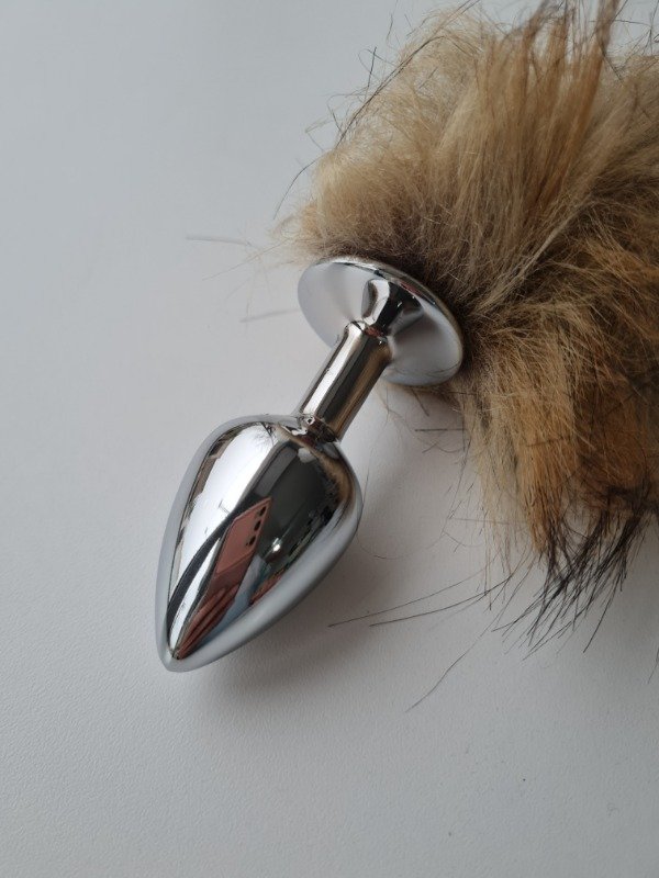 Plug anal de acero tamaño small, con cola de zorro. Largo del plug (con base): 6,5 cm. Largo total con la cola: 40 cm